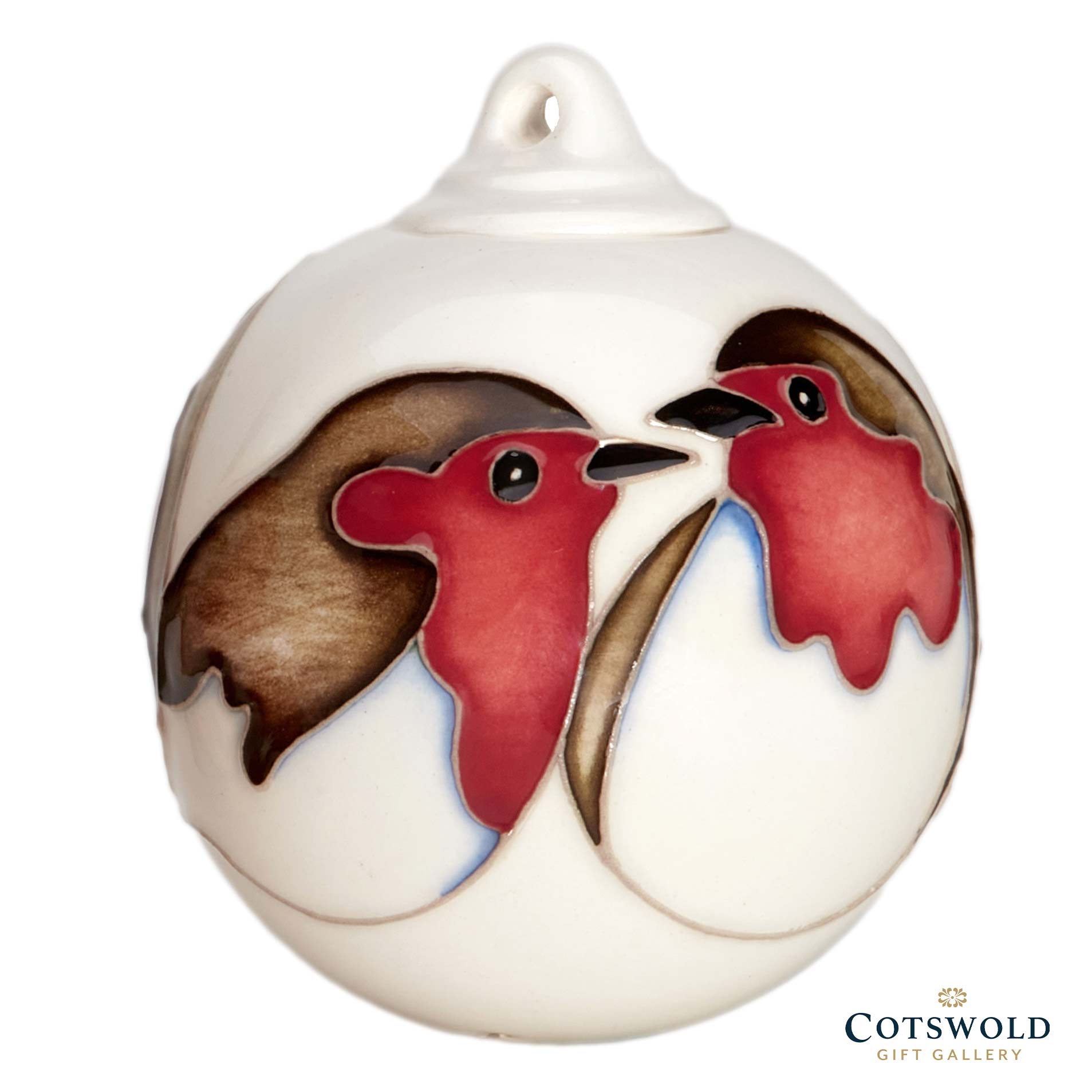 With their cheerful red breasts, the robin indicates tenacity and life: there are few birds that evoke such affection as the little red robin. Moorcroft Pottery designer Kerry Goodwin portrays her robins on a Christmas bauble, huddled together for comfort.